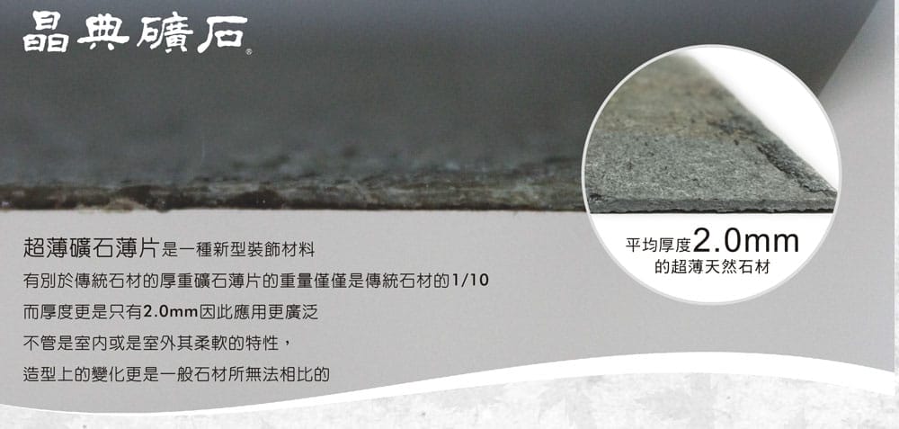- 質量輕、可彎曲、色彩豐富、獨一無二的紋路